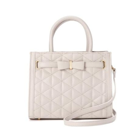 リボンディテールが愛らしいアクセントになるキルティングトートバッグ。表側のキルティングデザインが上品に映え、女性らしいカラーがどんなコーディネートにも合わせやすいアイテムです。口元はファスナー開閉、マチがあるので貴重品など必要最低限のモノが収納できます。肩掛けできるショルダーは取り外し可能です。