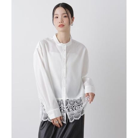 シンプルながら、女性らしさを引き立てるデザインシャツ。裾にあしらった繊細で華やかなレースがアクセントとなり、ややオーバーサイズのシルエットが抜け感のある着こなしを演出。春夏はもちろん、秋口の羽織やジャケットのインナーとしても活躍するロングシーズン使えるアイテムです。