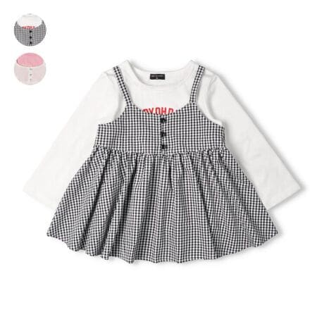 ダディコのプリントの長袖Tシャツ、ロンTとキャミソールの2枚セット。ロンTだけでも、キャミを他のTシャツと合わせても!別々にも2枚合わせても着られる!着回しも色々出来るアイテム。【アイテム】トップス シンプル ガーリー フェミニン カジュアル お洒落 オシャレ かわいい 可愛い 普段着 デイリーウェア お出かけ着 お外着 お外遊び着 子ども こども 女児 女の子 ガールズ キッズ ベビーサイズ トドラーサイズ 幼稚園 保育園 小学校 通園 通学 小学生 2026年春夏物新作 丸高衣料 ロングスリーブ 長袖 ホワイト 白色 ギンガムチェック ピンク ダディオダディ