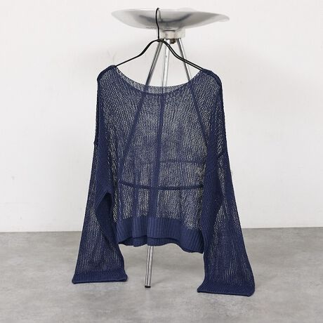 麻調のドライタッチなサマーニット素材。透け感がしっかりあるので、色味の濃いインナーはハッキリ透けて見える場合があります。※編み目が広い為、アクセサリー等の引っかけにご注意ください。
