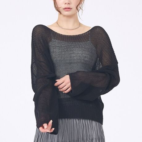 麻調のドライタッチなサマーニット素材。透け感がしっかりあるので、色味の濃いインナーはハッキリ透けて見える場合があります。※編み目が広い為、アクセサリー等の引っかけにご注意ください。
