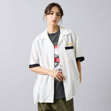 リラックスシルエットの半袖オープンカラーシャツ。黒・白を基調に袖口と胸ポケットの切替えライン、胸元の「Deus」&バック刺繍がアクセントになったデザイン。程よい抜け感でデニムやチノに合わせやすく、男女問わず着回しの効くユニセックスアイテムです。
