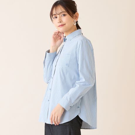 綿混の爽やかな風合いのストライプシャツです。程よいハリ感で肌離れがよくスッキリと着ていただけます。