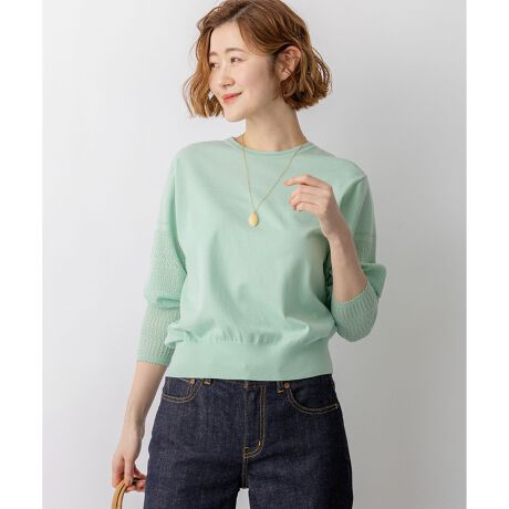 袖と襟元にあしらわれた繊細なレース柄が目を惹く、七分袖のプルオーバーです。程よくゆとりのある袖のデザインが、気になる二の腕周りを自然にカバーしつつ、全体はもたつかずすっきりとした美しいシルエットに仕上げています。袖口のスカラップディテールが、手元にさりげない可愛らしさと華やかさをプラス。 シンプルなパンツスタイルに合わせれば洗練された印象に、スカートと合わせれば甘すぎない大人のフェミニンスタイルにと、ボトムス次第で様々な表情を楽しめます。 カラーは、顔周りを明るく優しげに見せるアイボリー(#002)、落ち着いたトーンで洒落感のあるスモーキーグリーン(#063)、知的で引き締まった印象を与えるネイビー(#075)の3色展開です。