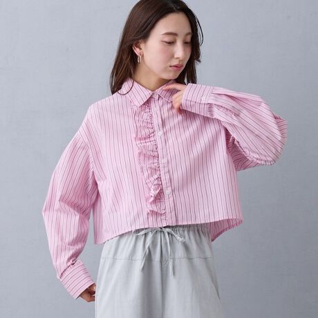 前のフリルが目を惹く春らしいストライプシャツ。