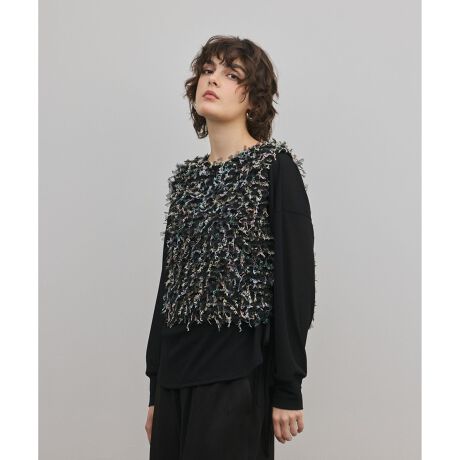 カラフルで可愛らしい素材を活かしたショートベスト。チュール素材のフリンジの中に、カラフルな配色感が特徴的なファンシーヤーンとチュールを入れ込み刺繍で表現した、華やかで贅沢な表情が一際目を惹きます。前後どちらでも使える2way仕様で、V開きを前にしたりクルーネックを前にしたりとまた印象を変えてお楽しみいただけるのも魅力。短めの着丈でコンパクトに仕上げ、素材の可愛らしさを存分に生かしたお作りに。サイドには長めの紐を飾り、垂らしたりリボンを結んだりと動きのあるアクセントとして効かせました。まだ寒さが残る時期はニットに、暖かくなったらシアートップスにレイヤードして。様々な着回しをぜひお楽しみください。