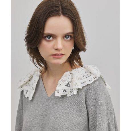 [型番:0326143363]綿素材の表面感のあるカノコ編みに、取り外し可能なバテンレースを付けたニットトップス。※こちらのモデル着用画像はサンプル品を撮影しております。実際の商品と仕様、加工、サイズが若干異なる場合がございます。予めご了承くださいませ。