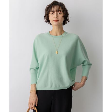 天竺編みですっきりと仕上げた、7分袖のクルーネックドルマンプルオーバーです。ゆったりとしたドルマンスリーブのデザインが、体のラインを拾いすぎず、リラックス感のある着心地と体型カバーを同時に叶えます。裾には前後の長さに変化をつけているため、そのまま着るのはもちろん、襟元を少し後ろに抜いて着用していただくと、デコルテ周りがすっきりと見え、より女性らしく柔らかな印象を演出できます。 袖口に施したスリットが手元のさりげないアクセントになり、時計やブレスレットなどのアクセサリーも映えるデザインです。シンプルなボトムスに合わせるだけで洗練されたスタイリングが完成し、きれいめパンツと合わせればオフィスシーンに、デニムやフレアスカートと合わせれば休日のカジュアルスタイルにと、幅広いシーンで活躍します。 カラーは、着回し力抜群で上品なアイボリー(#002)、コーディネートの主役になる華やかなコーラル(#011)、トレンド感のある落ち着いたスモーキーグリーン(#063)、爽やかで清潔感のあるスカイブルー(#072)、シーンを問わず使える知的なネイビー(#075)の5色展開です。