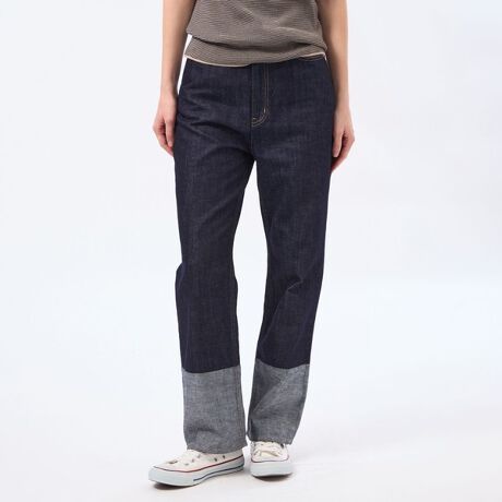 裾をターンバックしたようなカラーブロックがポイントになったストレートシルエットデニム。やや短め丈にすることで、抜け感もありすっきりした足元にみせてくれます。同素材のジャケットとのセットアップコーディネートもおすすめです。