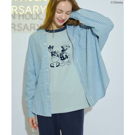 「ミッキーマウス」、「ミニーマウス」、「グーフィー」×「プルート」、「ドナルドダック」×「デイジーダック」がそれぞれフロッキープリントされたバイカラーリンガーTシャツ。プリント部分と衿ぐりのバインダーを同色で揃え、統一感のある仕上がりに。色あせたようなボディカラーにすることで、程よくビンテージライクな風合いを演出しました。シンプルに一枚で着ても、シャツやジャケットとのレイヤードでも映える万能アイテムです。