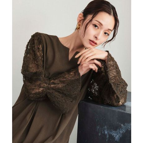 キーネックで首元をスッキリと見せ、レースショルダーが気になる二の腕もしっかりとカバーしてくれます。