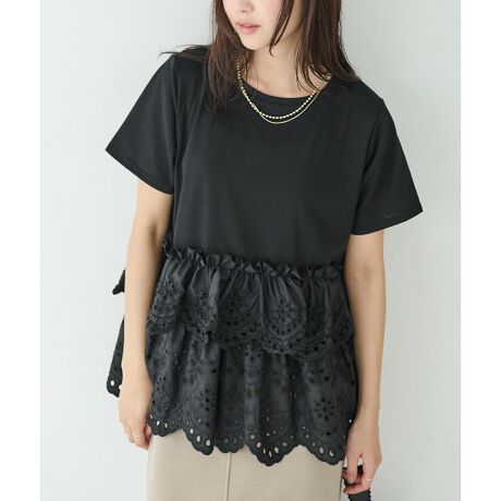 きれいめな生地感のTシャツにナチュラルな風合いの刺繍レースをドッキングしたデザイン。