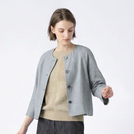 [型番:72263230511]女性らしくリラックスした表情を作れるノーカラージャケット。適度なゆとりで羽織りやすく、すっきりした着丈でスタイル良くきまるのもうれしい。日差しのある日にも心地良い、さらりとした質感になっています。※商品画像はサンプルを使用しているため、実際の商品と色味などの仕様が異なる場合がございます。予めご了承ください。model:T.167着用サイズ:38