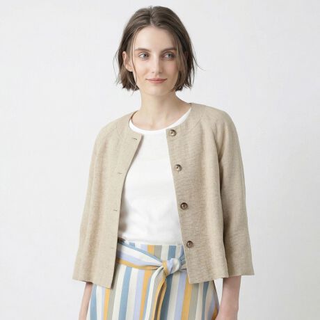 [型番:72263230511]女性らしくリラックスした表情を作れるノーカラージャケット。適度なゆとりで羽織りやすく、すっきりした着丈でスタイル良くきまるのもうれしい。日差しのある日にも心地良い、さらりとした質感になっています。※商品画像はサンプルを使用しているため、実際の商品と色味などの仕様が異なる場合がございます。予めご了承ください。model:T.167着用サイズ:38