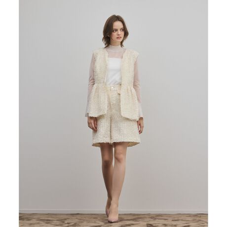 [型番:0126116221]シアー感のある基布に開いた緯糸が華やかなカットジャガード素材のハーフパンツ。同シリーズでおつくりしたカットジャガードペプラムジレ【品番:0126157221】のご用意もございます。※こちらのモデル着用画像はサンプル品を撮影しております。実際の商品と仕様、加工、サイズが若干異なる場合がございます。予めご了承くださいませ。