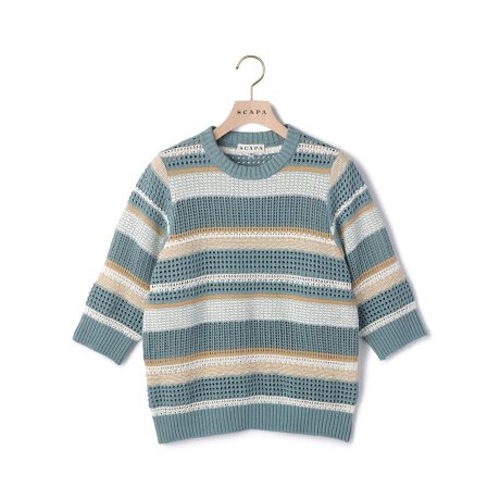 [型番:72263180551]着こなしに軽やかな表情を与える透かし編みニット。ワイドボーダー柄がアクセントになって、メリハリのあるスタイリングを叶えます。手首ののぞく5分袖で、女性らしさも演出できる一枚。※商品画像はサンプルを使用しているため、実際の商品と色味などの仕様が異なる場合がございます。予めご了承ください。