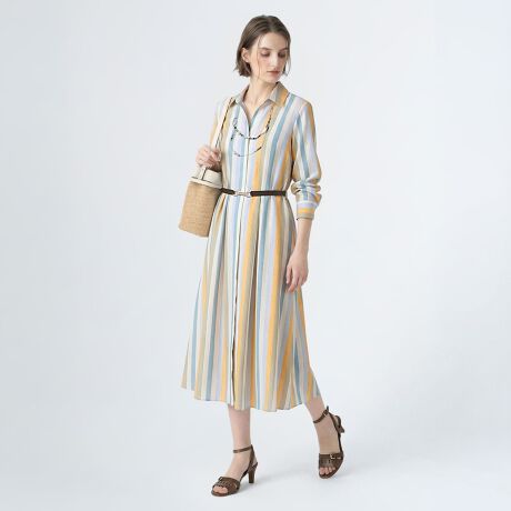 [型番:72263210521]ドレッシーでいて爽やかなマルチストライプ柄ワンピース。甘くなりすぎない比翼シャツ仕立てで、オンオフ問わずさらりと着こなせます。ウエストベルトでアレンジを楽しめるのもポイント。※商品画像はサンプルを使用しているため、実際の商品と色味などの仕様が異なる場合がございます。予めご了承ください。model:T.167着用サイズ:38