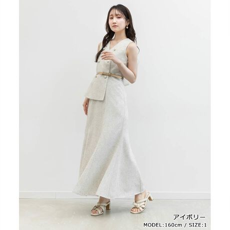 洗練されたマーメイドシルエットが際立つ、ノーカラーのジャケットライクワンピース。