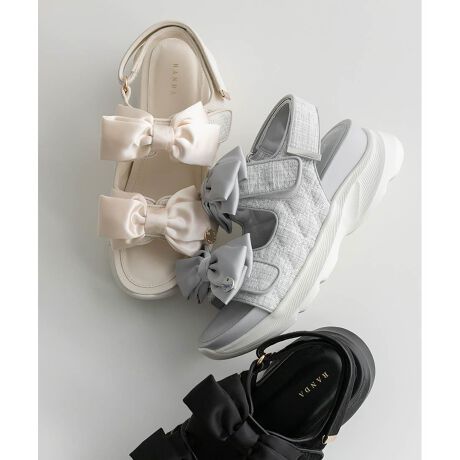 サテンで仕上げた艶やかなボリュームリボンがポイントのスポーツサンダル。