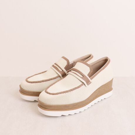 ・木目調とホワイトソールの厚底がポイントのローファー。