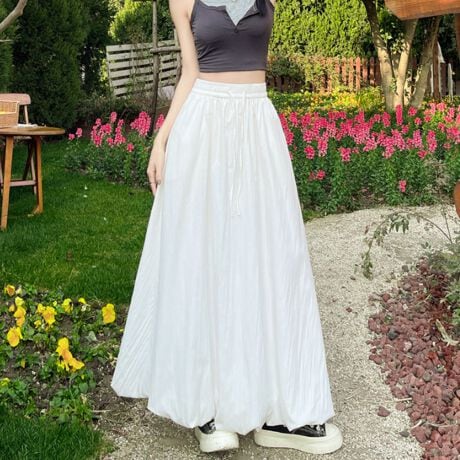 -ふんわり揺れるフレアシルエットが女性らしいロングスカート。