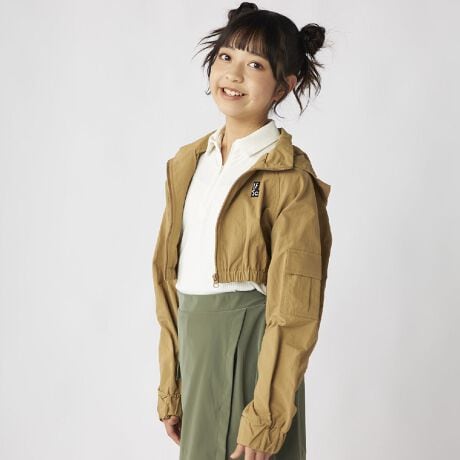 【LOWRYS FARM SCHOOL/ローリーズファームスクール】ナチュラルなシワ感が魅力的なナイロンテックのショートフードジャケット。ウエスト位置を高く見せるショート丈が、スタイルアップを叶えます。 シャカシャカとした軽やかな素材感と、たっぷりとしたボリューム袖のバランスが、今どきのストリートスタイルを完成させ、中からロンTやシャツを覗かせるレイヤードスタイルはもちろん、ハイウエストのボトムスやワンピースとも相性抜群!