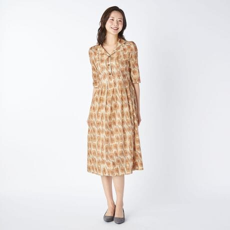 幾何学模様のようなグラデーションのマーブル模様が印象的なロング丈ワンピースです。デコルテがのぞく開衿デザインが肌見せの抜け感をプラス、さりげないタック切り替えが女性らしいウエストラインをメイクしてくれます。これ1着でトータルコーデがかなう主役アイテムで、リゾートやパーティーにもぴったりです。