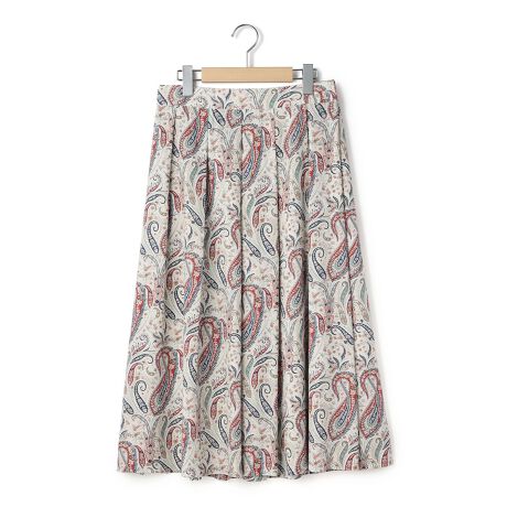 遠目にも存在感たっぷり、華やかな着こなしをかなえてくれるペイズリー柄のスカートです。膝がかくれるきちんと感のあるミディ丈、動きにあわせて広がるタックプリーツをあしらいました。ウエストの後ろはゴム切り替えでトップスINしやすくお腹まわりも楽ちん、あえてカジュアルなTシャツとの組み合わせもおすすめです。