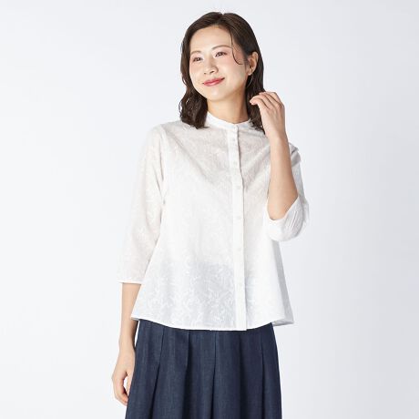 アイテム全体にミモザモチーフの刺繍をあしらったブラウスです。顔まわりをすっきりと見せてくれるトレンドのバンドカラー、1枚着はもちろんジャケットやカーディガンのインナーとしても存在感を発揮します。ほど良い透け感のあるコットン素材と7分袖で、ロングシーズンお使いいただけるアイテムです。
