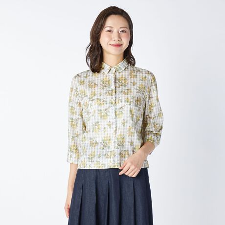 ギンガムチェック柄にミモザをあしらった、異柄MIXデザインのブラウスです。きちんと品良く着られる定番の衿付きデザインで、1枚着はもちろんジャケットやカーディガンのインナーとしても存在感を発揮します。ほど良い透け感のあるコットン素材の7分袖で、ロングシーズンお使いいただけるアイテムです。
