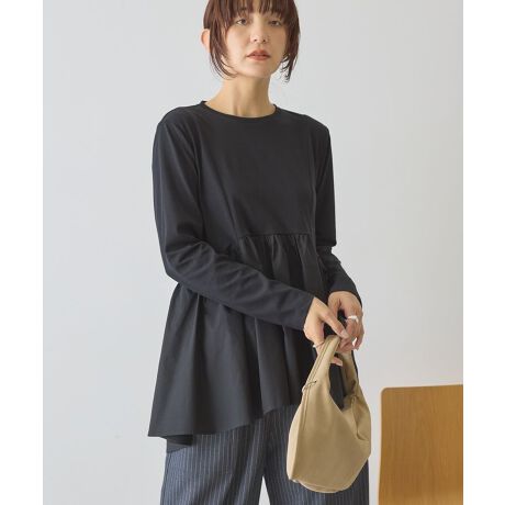 カットソーと布帛素材を組み合わせたデザインプルオーバー。カットソー部分は程よくフィットしつつ、ふんわり広がる布帛素材のペプラムラインが品良くフェミニンに演出します。前後差のある長めの着丈が気になる部分をカバーして、スタイルアップを後押し。ロングTシャツのように楽な着心地ながらブラウスライクな綺麗見えも叶う、デイリーからセレモニーシーンまで幅広く活躍するアイテムです。透け感[ややあり]