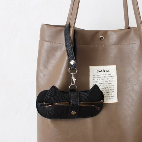 猫の顔型デザインがキュートなストラップ付きメガネケース。