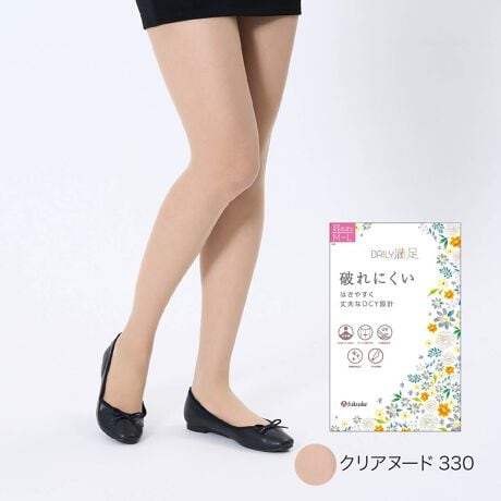 「満足」のセカンドライン「DAILY満足シリーズ」です。すべて多足組ですので、コスパ重視の方にもおすすめ。快適な履き心地と日常使いに嬉しい耐久性を追求した一品です。特徴的なDCY交編(ダブルカバリングヤーン)を採用することで、通常のストッキングよりも透明感があり優れたフィット感と高い耐久性を実現しました。