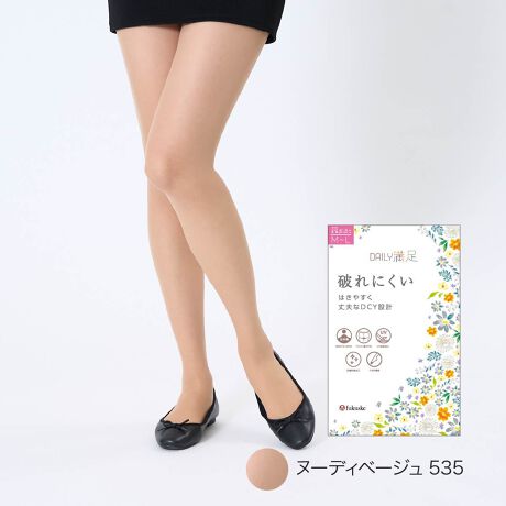 「満足」のセカンドライン「DAILY満足シリーズ」です。すべて多足組ですので、コスパ重視の方にもおすすめ。快適な履き心地と日常使いに嬉しい耐久性を追求した一品です。特徴的なDCY交編(ダブルカバリングヤーン)を採用することで、通常のストッキングよりも透明感があり優れたフィット感と高い耐久性を実現しました。