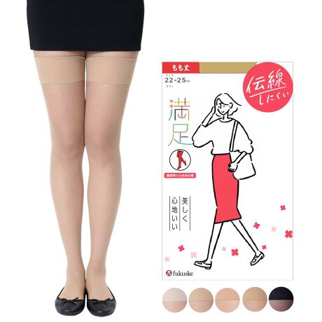 「満足」のもも丈ストッキングは、はき心地がやさしく心地いいのに脚キレイを叶えるとともに、「口ゴムのずり落ちにくさと締めつけにくい快適さ」を追求した商品です。生地全体が柔らかく、脚全体に自然にフィットするため、まるで何もはいていないようなはき心地を実現しました。独自の満足ノンラン設計により、万が一穴が開いても伝線しにくく、ストッキングを美しく保ちます。ずり落ちを防ぐために、太もも部分の口ゴム部分は、裏側(肌側)に滑り止め糸を使用した、福助オリジナルの「ずり落ちにくい口ゴム設計」を採用しており、一日中快適に過ごせます。さらに、ストッキングの消耗しやすいつま先は補強されており、抗菌防臭加工が施されているため、衛生面でも安心です。また、静電気防止加工も施されているので、衣類がまとわりつきにくく、スカートやアウターとのコーディネートも快適です。高い機能性と快適なはき心地を兼ね備えた、もも丈ストッキングの決定版です。