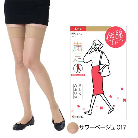 「満足」のもも丈ストッキングは、はき心地がやさしく心地いいのに脚キレイを叶えるとともに、「口ゴムのずり落ちにくさと締めつけにくい快適さ」を追求した商品です。生地全体が柔らかく、脚全体に自然にフィットするため、まるで何もはいていないようなはき心地を実現しました。独自の満足ノンラン設計により、万が一穴が開いても伝線しにくく、ストッキングを美しく保ちます。ずり落ちを防ぐために、太もも部分の口ゴム部分は、裏側(肌側)に滑り止め糸を使用した、福助オリジナルの「ずり落ちにくい口ゴム設計」を採用しており、一日中快適に過ごせます。さらに、ストッキングの消耗しやすいつま先は補強されており、抗菌防臭加工が施されているため、衛生面でも安心です。また、静電気防止加工も施されているので、衣類がまとわりつきにくく、スカートやアウターとのコーディネートも快適です。高い機能性と快適なはき心地を兼ね備えた、もも丈ストッキングの決定版です。