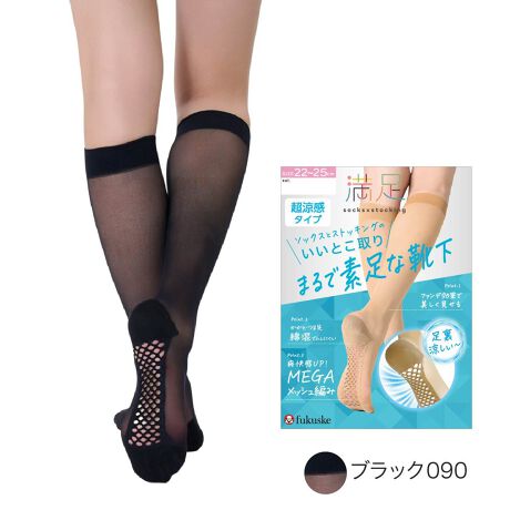 足裏の快適性と涼しさを追求した暑い季節にぴったりな高機能なアイテムです。最大の特長は、足裏が大きく穴の開いた福助独自設計の「メガメッシュ編み」になっていることです。通常の足底メッシュよりも大きく編み立てて通気性を大幅に向上させることで、汗などによる蒸れを軽減させます。さらに製品全体に「冷感加工」を施すことで暑い日でも涼しくお過ごしいただけます。それ以外にも履き心地にこだわり、つま先とかかと、口ゴムの内側を綿混素材にすることで、優れた吸湿性とさらっとした綿タッチの肌触りで快適に履いていただけます。足にしっかりフィットするように、靴下のようにかかと付のデザインを採用しているため、履いているうちに口ゴムがずれる等の不快感を軽減させています。丈は使いやすいハイソックス丈で、脹脛までしっかりカバーします。また、消臭加工が施されているため、気になるニオイを抑えるので、快適に着用いただけます。