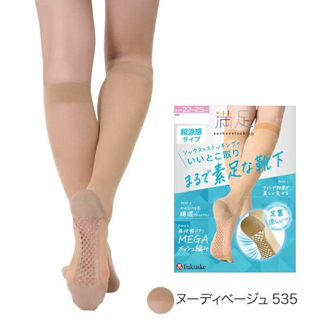 足裏の快適性と涼しさを追求した暑い季節にぴったりな高機能なアイテムです。最大の特長は、足裏が大きく穴の開いた福助独自設計の「メガメッシュ編み」になっていることです。通常の足底メッシュよりも大きく編み立てて通気性を大幅に向上させることで、汗などによる蒸れを軽減させます。さらに製品全体に「冷感加工」を施すことで暑い日でも涼しくお過ごしいただけます。それ以外にも履き心地にこだわり、つま先とかかと、口ゴムの内側を綿混素材にすることで、優れた吸湿性とさらっとした綿タッチの肌触りで快適に履いていただけます。足にしっかりフィットするように、靴下のようにかかと付のデザインを採用しているため、履いているうちに口ゴムがずれる等の不快感を軽減させています。丈は使いやすいハイソックス丈で、脹脛までしっかりカバーします。また、消臭加工が施されているため、気になるニオイを抑えるので、快適に着用いただけます。