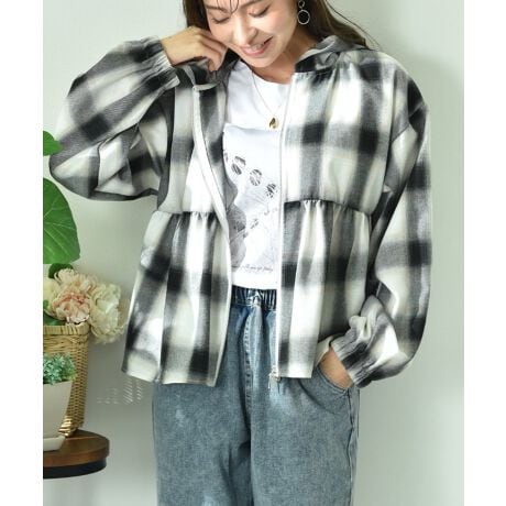 チェックペプラム切替ZIPフードジャケット