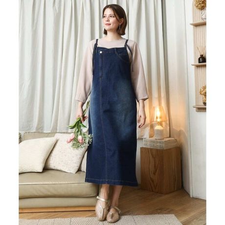 リメイク風ディテールが目を引く、カジュアルなキャミドレタイプのデニムジャンパースカート。