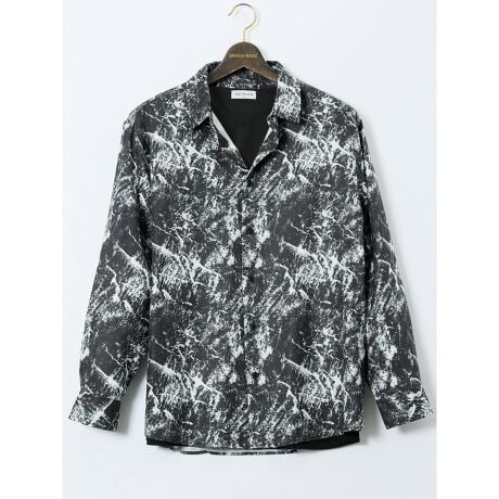 長袖シャツはポリエステル100%のアムンゼン生地にプリントしています。梨地織りの細かい凹凸感、落ち感のあるドレープ性、軽くてシワになりにくい、なめらかな着心地が特徴です。インナーの半袖Tシャツはポリエステル・コットンの天竺素材(黒無地)です。