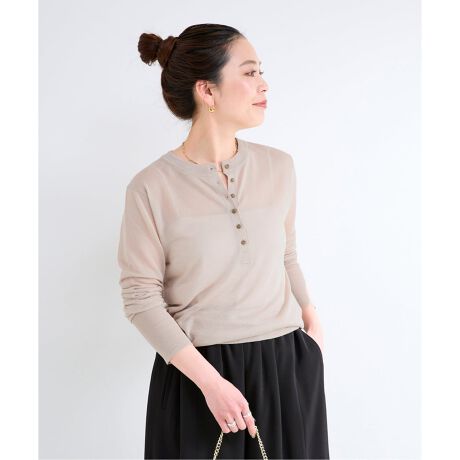程よいサイズ感で肌離れがよくドライタッチなのが特徴で、リラックス感のあるヘンリーネックデザインが普段使いとしても気軽に着れるアイテムです。強撚のレーヨンナイロン糸で透け感が強すぎず、あえてウォーム感のある色味でお作りし大人っぽい雰囲気にしています。手洗い可能でご自宅でのイージーケアができるのも嬉しいポイントです!