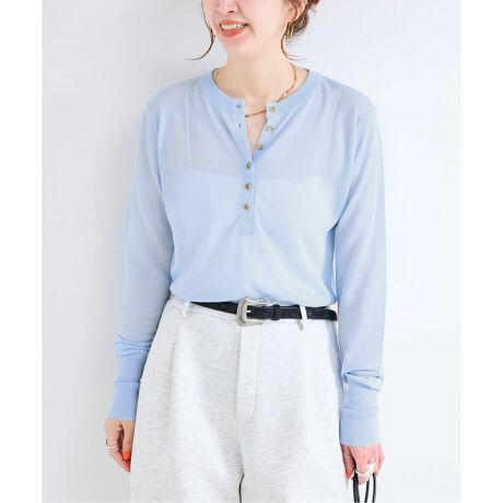 程よいサイズ感で肌離れがよくドライタッチなのが特徴で、リラックス感のあるヘンリーネックデザインが普段使いとしても気軽に着れるアイテムです。強撚のレーヨンナイロン糸で透け感が強すぎず、あえてウォーム感のある色味でお作りし大人っぽい雰囲気にしています。手洗い可能でご自宅でのイージーケアができるのも嬉しいポイントです!