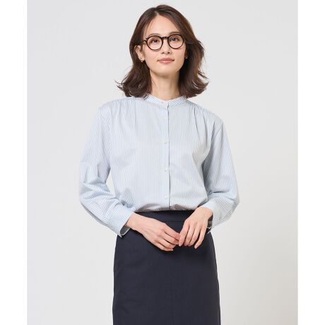 ■デザインやわらかなシルエットで女性らしく着こなせるバンドカラーのカットソー。肩と後ろヨーク部分のギャザーデザインが、自然な立体感を生み、ふんわりとした軽やかな印象に仕上げました。前あき仕様のため、1枚で着こなすのはもちろん、Tシャツやタンクトップの上に軽く羽織るスタイルもおすすめ。オフィスでのきちんと感のあるスタイルから、休日のカジュアルなお出かけまで、幅広いコーディネートに活躍する汎用性の高いアイテムです。カラーは、温かみのある上品なキャメルストライプ(#134)、爽やかで知的な印象のアクアストライプ(#172)、シックで落ち着いた雰囲気のネイビーストライプ(#175)の3色展開です。