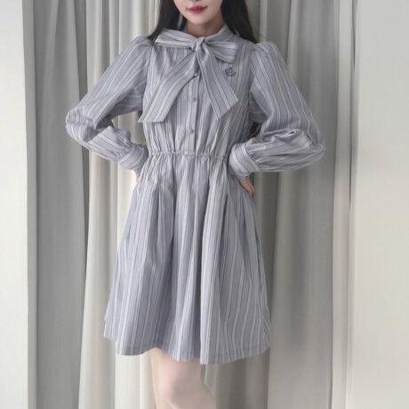 フロントのボウタイがキャッチーで目を惹くストライプワンピース