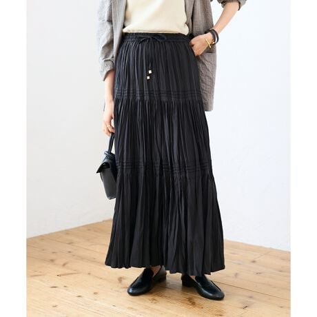 クリンクル加工でベーシックなプリーツよりも動きのあるデザインでキレイ目になりすぎず、カジュアルな雰囲気で着ていただけます。