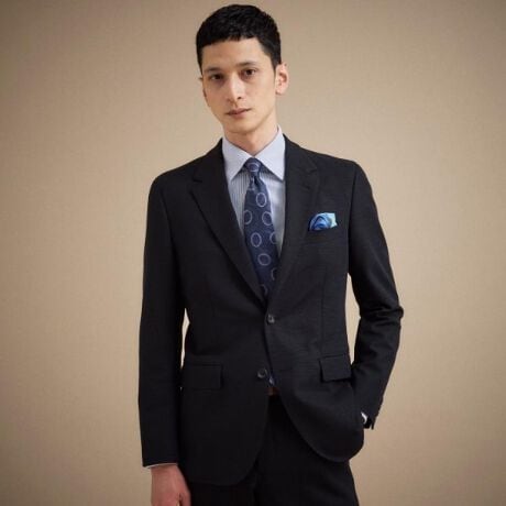 生地の凹凸感が立体的なフォルムを見せ、セットアップで着用でき、タイドアップからノンタイドのスタイルまで幅広くスタイリングが楽しめます。