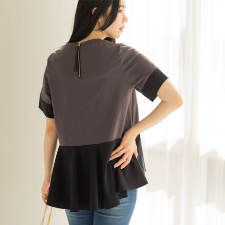 ・ペプラム部分と袖先を別素材で切替えた、ドッキングデザイントップス。