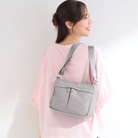メイン収納の他に、前ポケット、背面にもガバっと開くポケットをのあるショルダーバッグです。