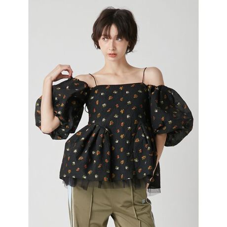 毎シーズン高い人気を誇るペプラムビスチェが、ディテールをアップデートして今季も登場。胸元は切り替えを無くし、すっきりと大人っぽい印象に。ペプラム部分にはチュールを挟み込み、裾からふわりと覗くチュールが儚くロマンティックなムードを演出します。花柄と無地の2タイプ展開で、スタイリングに合わせて選べるのも嬉しいポイント。付属のリボンはボタンで簡単に取り外しでき、パフスリーブ・オフショルダー・キャミソールの3WAYでアレンジ自在。コーディネートの幅がぐっと広がる主役級の一枚です。